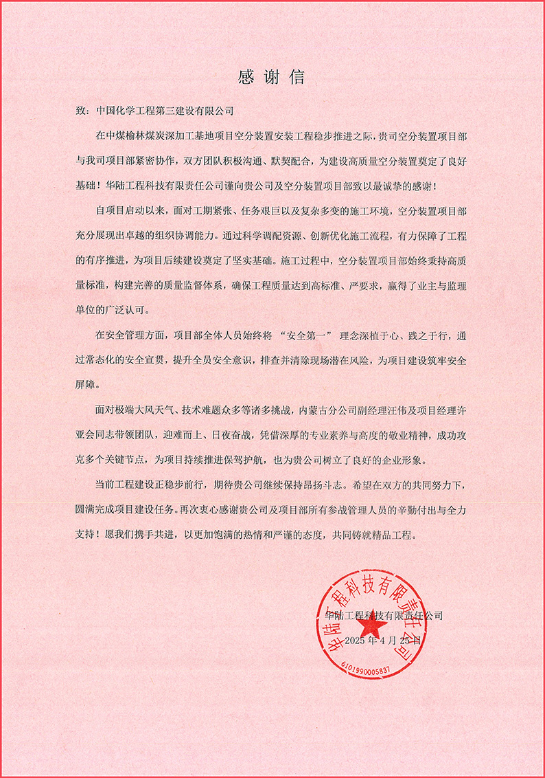 近日,半岛网页版收到华陆工程科技有限责任半岛(中国)官方发来的感谢信,对内蒙古分半岛(中国)官方在中煤榆林煤炭深加工基地项目空分装置安装工程中的出色表现给予高度评价,对项目部全体人员的辛勤付出和卓越贡献表示衷心感谢,并期待双方在未来的工程建设中继续携手共进,共铸精品工程。